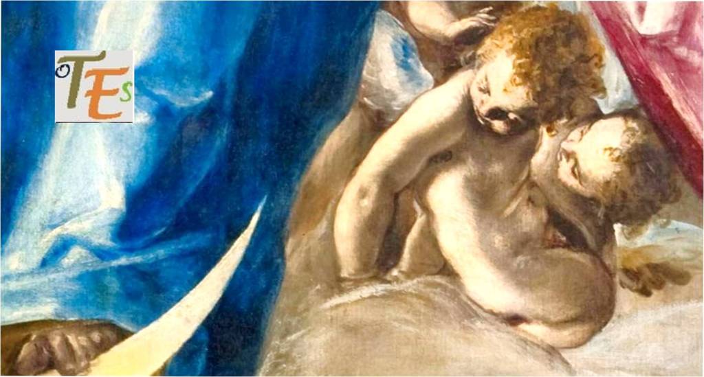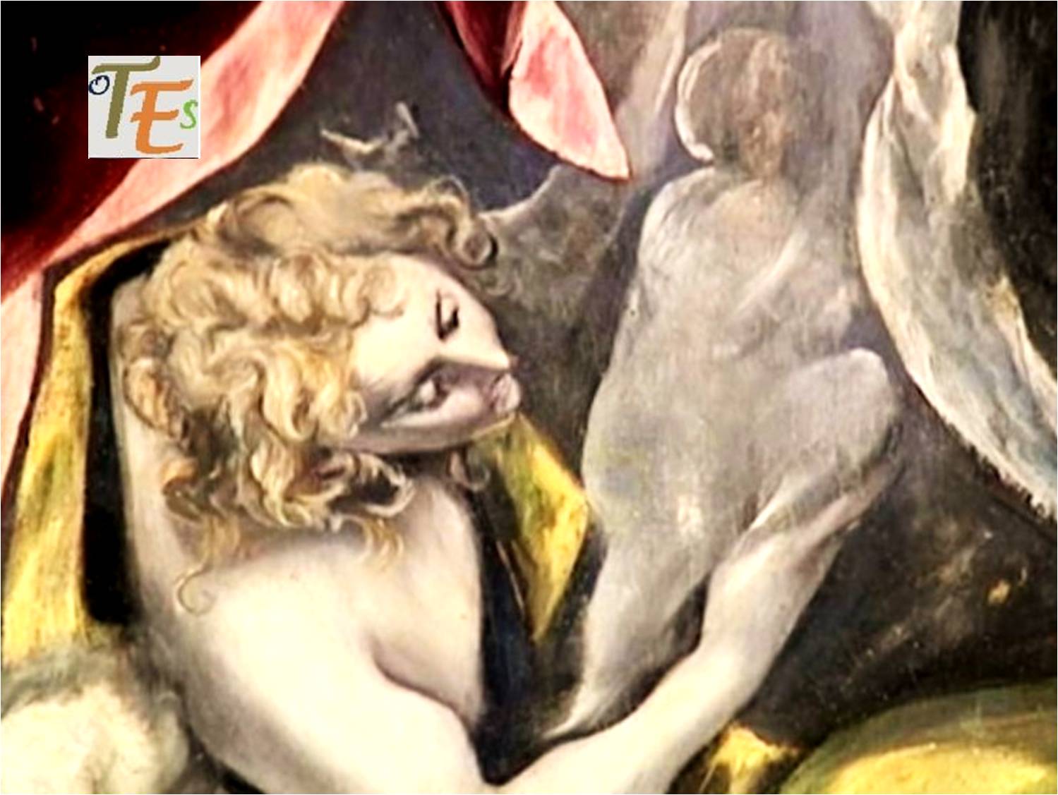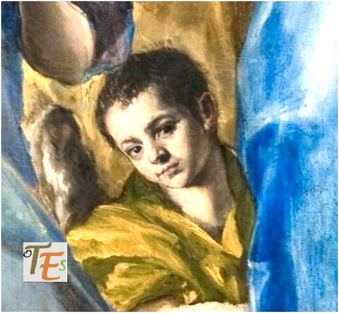 El Greco como observamos en esta primera pintura de su extensa obra toledana, nos deleitaba ya con una extraordinaria gama de actitudes, inflexiones y escorzos, aunque también con ciertos trucos misteriosos que nosotros ahora queremos descifrar. Solo hay que fijarnos en un ángel joven, casi escondido que se asoma por debajo tras el manto de la virgen al lado derecho, mirando al espectador. A quien pertenecerá dicho rostro y que nos querría trasmitir el pintor? Podría ser algún hijo suyo de la época italiana tras diez años en ese país?