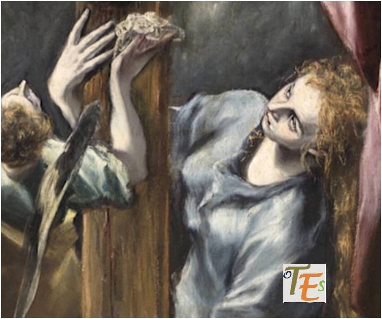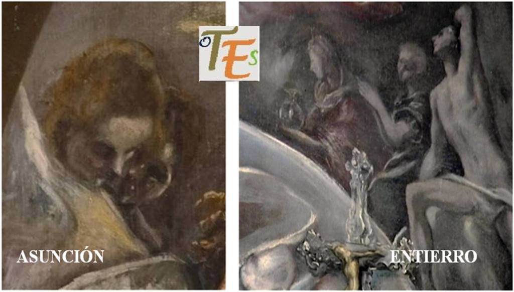 También usa ese modelo en su obra cumbre, como es en “El Entierro del Señor de Orgaz”, precisamente con el ángel que lleva el alma del difunto entre sus manos, por el “hueco de luz” que se abre hacia la gloria, donde le esperan la Vírgen y San Juan el bautista para interceder por él ante Cristo.