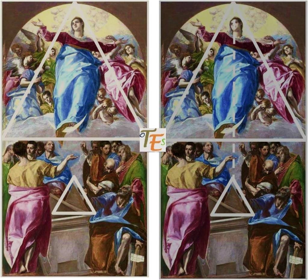 Dicha línea saliendo del triángulo menor, en su ascenso corta la luna creciente, pasa por el pie griego de la virgen, cruzando entre los salientes de los pliegues de sus piernas, así como su cara hasta llegar al vértice superior del triángulo mayor que rige la parte celeste, de ahí la técnica geométrica del Greco en esta su primera obra toledana.