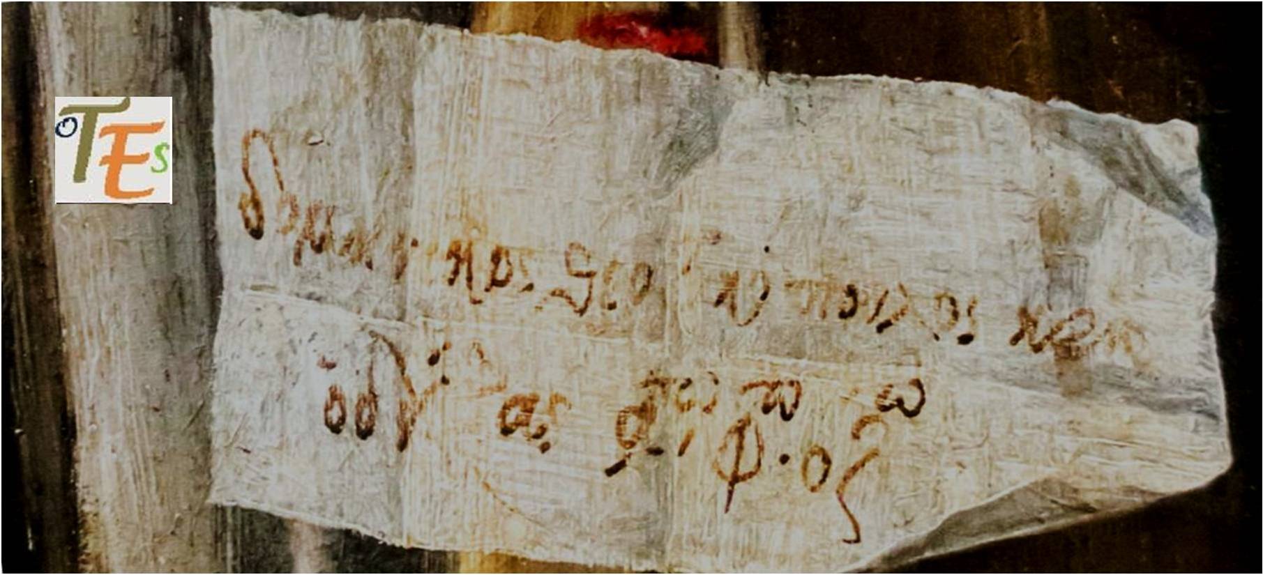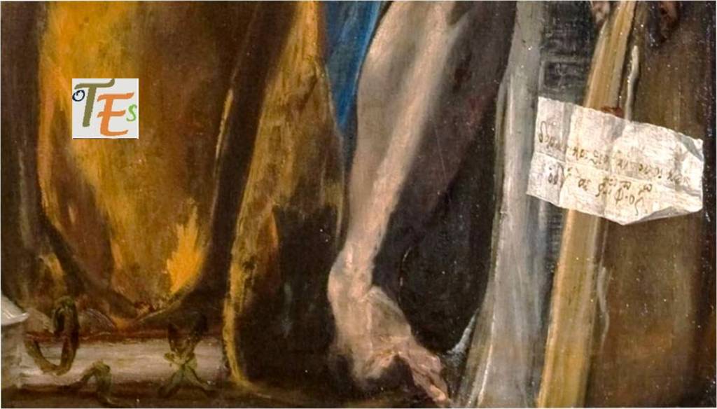 Tras el estudio por mi parte de esta simbólica obra, por lo demostrado hasta ahora sobre la misma, observemos su firma, la cual lleva a cabo sobre un papel blanco para resaltar su autoría. La pinta pegada simuladamente con lacre en el libro entreabierto que sustenta Tomás, queriéndonos decir con dicho detalle, que tras ella había ya una gran experiencia y mucha sabiduría. Lo hizo en caracteres griegos al estar recién llegado a Toledo, así como sus números para decirnos el año que comenzó a crearla en 1577 y terminarla en 1579.