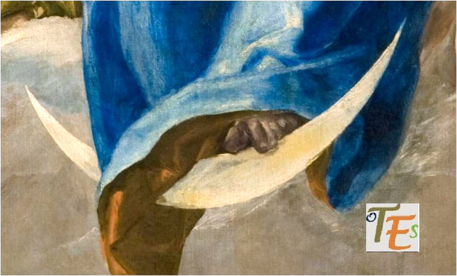 En su centro un creciente lunar con sus puntas hacia arriba, traspasando esta su vestidura, pisado por la Asunción con su pie griego, característica usada por el Greco en algunas de sus obras. Dicho detalle se refiere al papel mediador de la Virgen y su poder intercesor entre los hombres y el Eterno, pues la luz de la Luna refleja la del Sol. Así lo pintó en su Inmaculada Oballe de San Vicente entre 1608-13, con el sol y la luna reflejándose, tras el ángel en escorzo. Esta obra hoy en el Museo de S. Cruz de Toledo, refleja en sí a la Contrarreforma.
