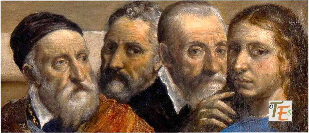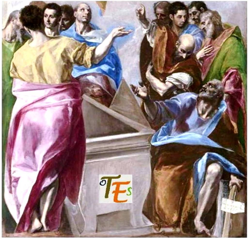 De ahí que el personaje que estudiamos bajo la esquina izquierda del cuadro, se refiera a Santo Tomás, pues este levanta su mano derecha, explicando de forma oculta el significado del detalle de la tapa del sarcófago, que explicaremos. Posturas y signos todos ellos, con respecto a la iniciación de oficio de los grandes maestros, cuyos detalles nos demuestran de forma secreta el verdadero pensamiento de Doménico Theotocópulis en su llegada a Toledo, pues tras su sutilidad contienen una lógica aplastante.