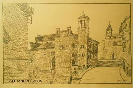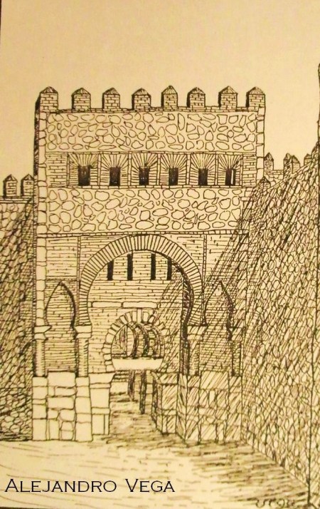 En esta plumilla se observa el extraordinario templo de Santiago el Mayor en estilo mudéjar, al fondo la trasera de la puerta de Bisagra, puerta principal de entrada a la ciudad desde el norte que antes de ser diseñada por Covarrubias en estilo renacentista, estuvo construida en estilo hispano-árabe.