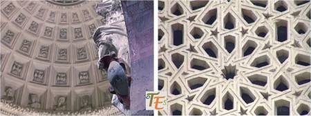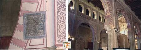 Hay inscripciones en árabe cúfico y filacterias en latín determinando la tolerancia toledana, roleos con palmas, aves, perlas y motivos vegetales en algunas de sus preciosas y ventanas lobuladas, algunas de ellas con ángel dentro, como si estos vinieran a recoger a las almas perdidas, por el famoso túnel que va desde la oscuridad del mundo a la luz del más allá.