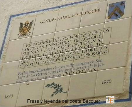 Si entramos por él, aquí en este punto a la derecha, veremos una lápida donde se nos cuenta que fue en este lugar, donde el poeta Gustavo Adolfo Bécquer se inspiró para su leyenda “Las Tres Fechas” y donde existe una máxima que dice: