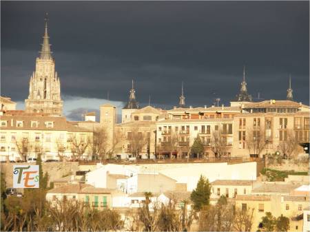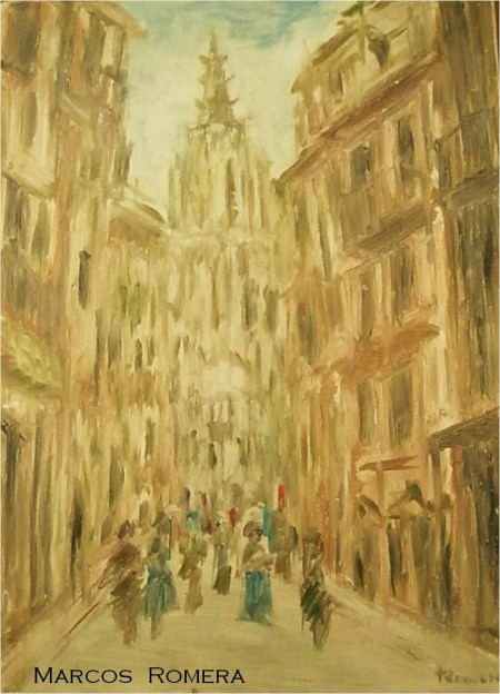 Desde luego la vista desde este lugar es increíblemente bella, así como cotidiana. Según nos vamos acercando hacía la catedral, llegando a las Cuatro Calles, muy cerca de su pórtico norte, la torre se observa más alta y esbelta en su conjunto. Presento aquí un esmalte desde el mismo lugar, del catedrático de dibujo Marcos Romera, amigo personal al que le encanta la ciudad de Toledo y en la que ha vivido.