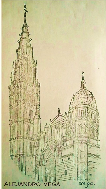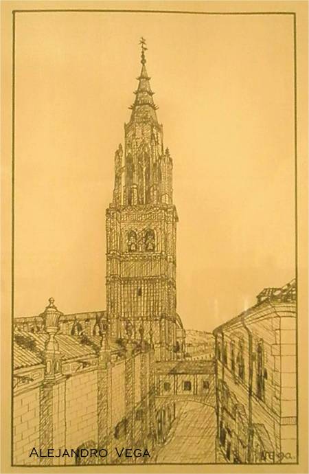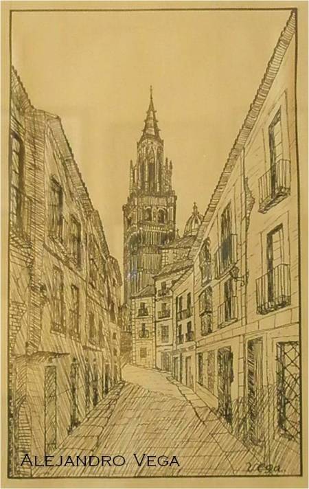 Otra plumilla que expongo aquí, se refiere a la misma torre norte, pero con una vista diferente, esta vez desde la calle del Comercio o “calle Ancha”, cuya arteria y paisaje reconocemos muy bien los toledanos de mi edad, pues en nuestra juventud era la vía más transitada por los jóvenes de aquel tiempo y donde se “tonteaba”, para ver quien paseaba o para mirar en los comercios de ropa que en ella había.