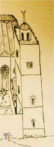 Dejo aquí constancia de todo lo que digo, con tres plumillas dibujadas entre sus calles, también el dibujo de lo que pudo ser su alminar islámico, terminando con otra plumilla más sobre la cara oeste del templo, donde podemos observar sus pórticos principales, así como sus dos torres, vista esta desde la plaza del Ayuntamiento.
