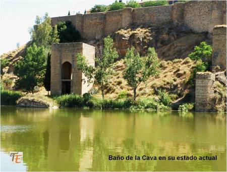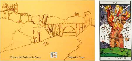 En la zona baja parte de la central eléctrica de Santa Ana y al otro lado del puente, se encuentra el Baño de Cava, que observamos en un esbozo, también con su leyenda, entre los personajes de Florinda, hija del conde Dº Julián y el rey godo Dº Rodrigo que por la rotura de un voto convirtieron en realidad el presagio de la entrada de los musulmanes en Hispania. Si le miramos bien, su alegoría de tradición heterodoxa, corresponde con un arcano del Tarot nº XVI, la “Torre herida por el rayo”.