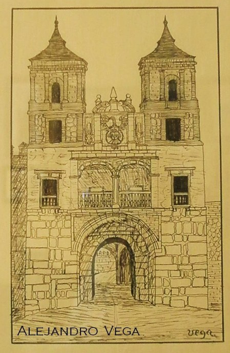 Su torre exterior es imponente por su solidez, aunque restaurada tras la guerra de Pedro I y Enrique II. Al otro lado vemos según mi dibujo, su otra torre más austera y a su lado las ruinas del castillo que fue fortaleza de los judíos, pues justo al lado vemos el muro de su Judería Grande y al otro lado la hoy desaparecida puerta de San Martín, construida en ladrillo que servía para obtener los impuestos para el Ayuntamiento. Por encima las torres de la puerta del Cambrón y a un lado el imponente edificio del convento de San Juan de los Reyes.