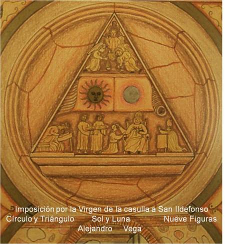De forma heterodoxa observamos a nueve personajes, como número contenedor de un ciclo en simbología, que al ser alcanzado, puede hacernos acceder tanto hacia el bien como hacia el mal. Allí observamos al trino alado por sus ángeles y bajo el la dualidad del sol y de la luna, astros que nos dan la vida y hacer moverse a los hombres, por tal motivo es llamada por mí como puerta del Sol y de Luna.