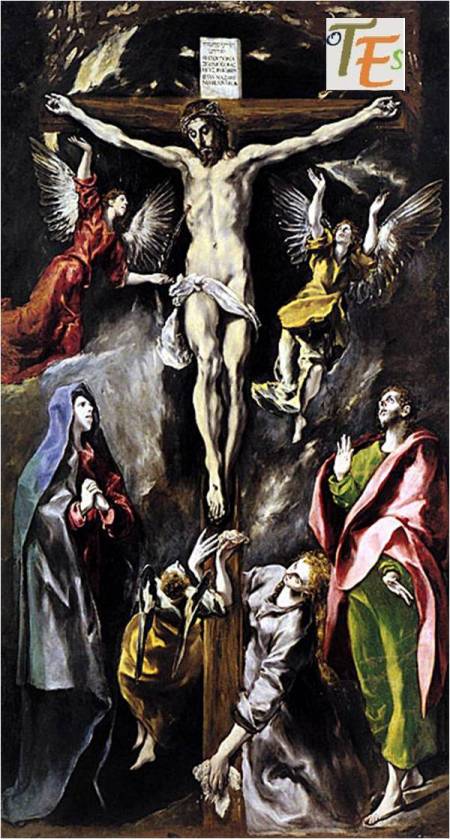 A los lados, la Virgen y San Juan observan la expiración de Cristo. Por encima ángeles, que recogencon sus manos la sangre que este derrama, convirtiéndose en auntánticos griales.