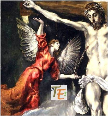 Otro ángel en dificil escorzo junto a la Magdalena, que miran los últimos instantes del crucificado y limpian con paños el madero «stípites», el más largo que forma la larga «crux inmisa».
