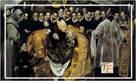 Personajes de la aristocracia toledana, aferrados a la tierra madre, en un rectágulo donde se está ejecutando el entierro del Señor de Orgaz, por medio de dos personajes católicos, un protomártir y un padre de la iglesia.