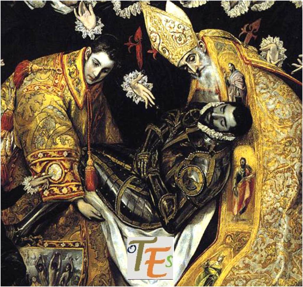 Personajes de la aristocracia toledana, aferrados a la tierra madre, en un rectágulo donde se está ejecutando el entierro del Señor de Orgaz, por medio de dos personajes católicos, un protomártir y un padre de la iglesia.