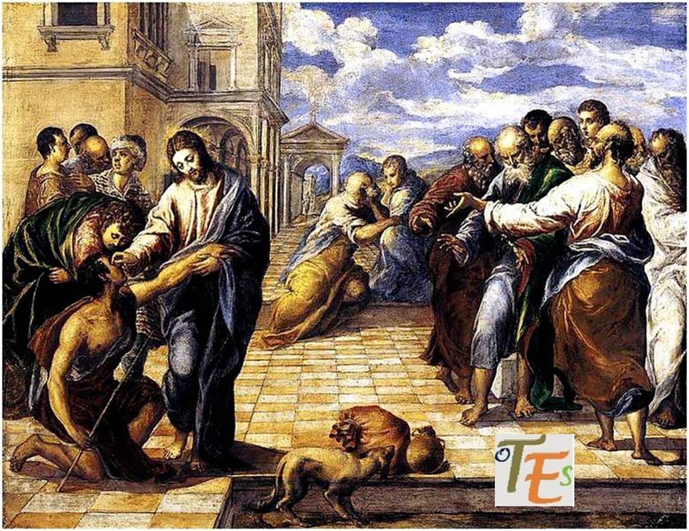 Se observa ya un gran colorido y perspectiva, dando un gran salto en su pintura, en su inicial etapa italiana. Pese a que este pasaje se encuentra descrito en los cuatro evangelios canónicos, la escena se desarrolla según el evangelio según San Juan, pues en él vemos la piscina de Siloé, descubierta en Jerusalén en el año 2005.