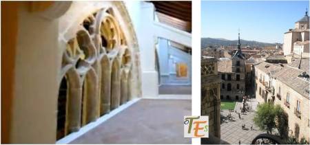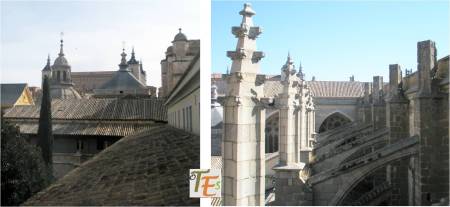 Subiendo una pequeña escalera se llega a una ventana desde donde se divisa el lateral sur del claustro, desde donde podemos ver entre otras cosas interesantes sus bellas vistas con otros edificios, así como sus contrafuertes, pináculos y arbotantes y algunos de los triforios que recorren tanto los pasillos colaterales bajos y laterales altos. En fin, todo un laberinto, que deja impresionado al ser sensible que observa este espectáculo único como son las alturas de la Santa Iglesia Catedral Primada de Toledo.