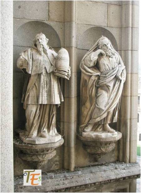 Siguiendo ese mismo pasillo se accede al corredor neoclásico que hay al exterior del lado oeste, sobre el pórtico de las Palmas o del Infierno. Allí observamos estatuas de santos y profetas, así como una buena vista de la plaza del Ayuntamiento con una de sus torres, el Palacio Arzobispal y la altura hasta su base, por donde fue subida la “campana gorda”. Desde aquí se entra directamente en la torre y se van recorriendo varias de las partes de su interior.