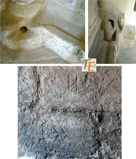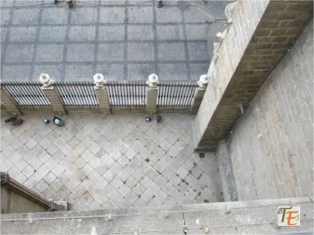 Siguiendo ahora en el interior de la torre, por el mismo pasillo se accede a la sala de poleas, cuyo habitáculo dentro de la propia catedral, se usaba como cárcel particular para los canónigos, denominada también como sala fuerte con este motivo, por eso en esta estancia observamos una especie de sumidero, siendo usado por los presos que allí tenían que cumplir su sentencia. Si nos fijamos en sus paredes podemos ver los símbolos canteros grabados en plan geométrico, con que se signaban las piedras, para entre otras cosas poder reconocer que oficial las había tallado y así poder cobrar su salario.