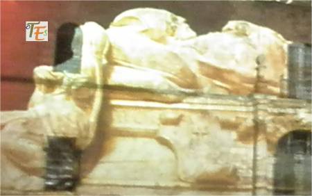 También observamos que el campanario termina en un cascarón ojival, cuyos nervios saliendo de las esquinas van a parar al centro donde se halla su clave de bóveda en la que vemos tallado lógicamente al cordero místico, como terminación de esta parte de la torre correspondiendo con el símbolo de la santidad y sacrificio de Cristo.