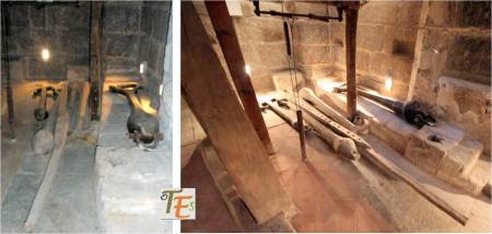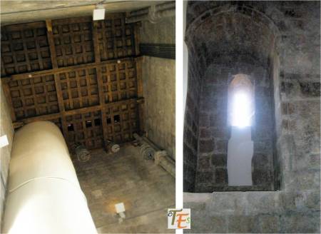 En la alta estancia se observa también lo que llaman la “chimenea del campanero” que es por donde corrían las cuerdas para los toques de las campanas, que sube hacia las alturas y en su parte alta, bajo un techo posterior de madera, aún vemos las pesas que sirven para contrapeso del reloj de la torre, que se encuentra por encima de este entresuelo de madera. También observamos amplios huecos a sus lados con pequeñas aberturas o aspilleras, para que entre una luz difusa a lo que fue la antigua cárcel.