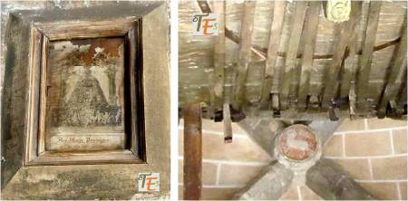 En una de las esquinas del campanario, sobre su pared y cogida al muro, nos encontramos una lámina casi carcomida, que representa a la Virgen del Sagrario, siendo una especie de saludo religioso al entrar en la torre, pues dice: “Ave María Purísima. Sin Pecado Concebida”.