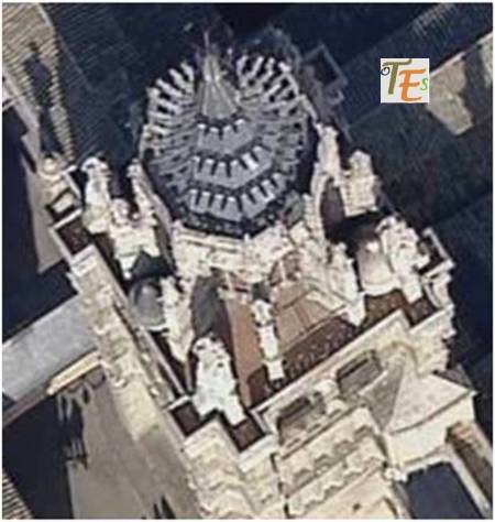 Contiene tres niveles, teniendo salida cada una de ellos por su puerta y señalados por tres coronas de hierro al exterior repletas de rayos, simbolizando a una tiara pontifical o gorro de santidad por sus tres coronas, pues desde la lejanía se debía distinguir como iglesia primada de los reinos de España. A dichos rayos se le colocaban faroles de colores en las fiestas más principales, debiendo dar una sensación increíble y que esta es la grandiosa aguja terminada en punta, como su quisiera llegar al cielo y rasgarle.