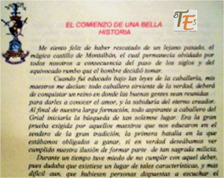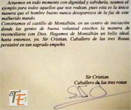 Con respecto al castillo, una de las ocasiones importantes entre otras, vividas en el mismo, fue el ver aparecer a Sir Cristian a las tres de la madrugada del viernes santo, con su gente y recibir de sus manos sus escritos, los cuales aún conservo.