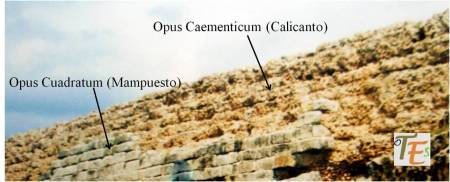 Se encontraba construido el muro estructuralmente con diferentes tipos de hormigón y cal, desarrollado por medio de dos partes muy gruesas de calicanto, con piedras y chinas de diferentes tipos (opus caementicium), que contenían un núcleo en su parte central con un calicanto de mezcla más fina (opus concretum) que constituía la parte impermeabilizadora del gran paredón, lo que ahora se denomina en albañilería como muro o cimiento corrido.