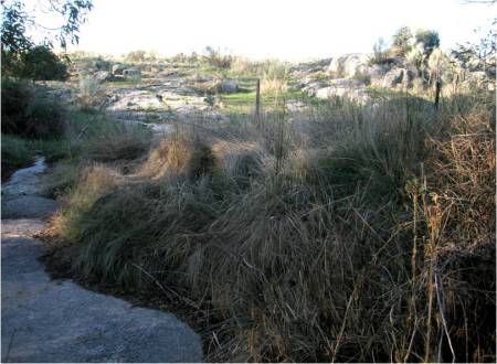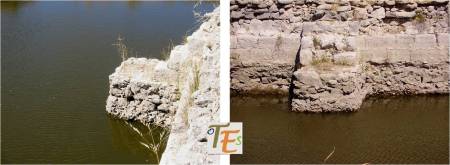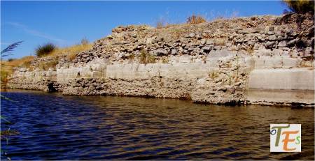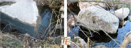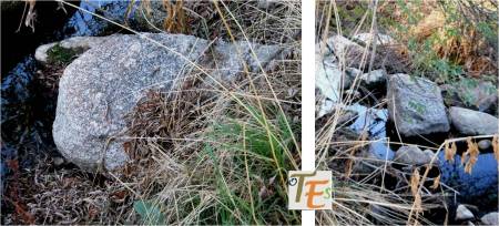 Esto nos hizo pensar, que estas debían de pertenecer a la propia presa, arrastradas hasta aquí por la fuerza del agua  o quizás a un paso-puente hundido por las aguas, pues  frente a ellas, se abría hacia la sierra un paso abierto con una de sus paredes talladas.