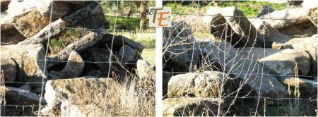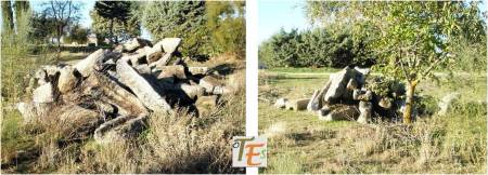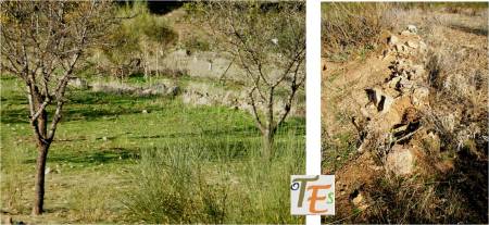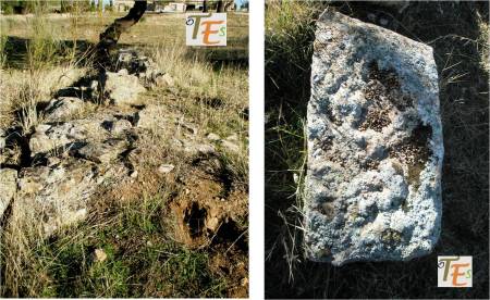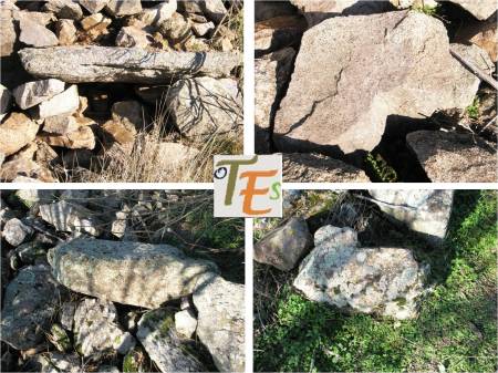 Seguimos el camino y ya pasados más de dos kilómetros de la presa, volvimos a ver aún más vestigios al lado derecho del mismo, entre monte bajo y árboles frutales, aunque ya bastante destruidos, pues con las labores del campo, cantidad de piedras han sido desplazadas, dejando grandes montones al borde del propio camino y  a donde se ven aún que muchas de ellas se encuentran talladas por la mano del hombre y como es lógico, al ser tan grandes, debieron de pertenecer al canal de conducción de las aguas del rio Guajaraz.