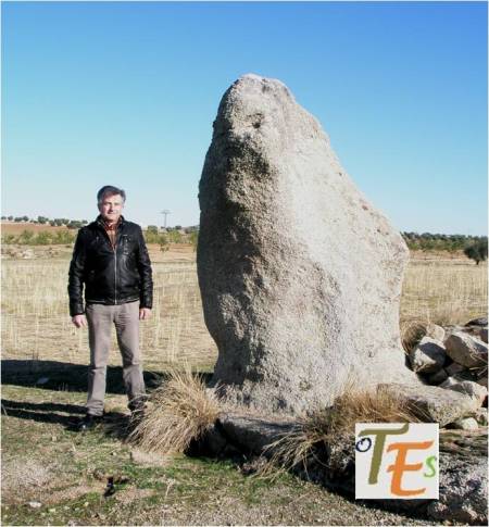 Como es lógico hacia allí nos encaminamos, para ver que se trataba realmente   lo que intuíamos. Al llegar observamos una especie de menhir, que desde allí y en el centro de dicho campo podría tener la misión desde antiguo de dar energía telúrica a todo el labrantío en el que se halla y los alrededores, para dar mucha más producción. Dejo aquí varias fotografías con diferentes perspectivas del mismo, para poder darse una idea del volumen de este antiguo monolito y de su altura con respecto a mi compañero Jesús.