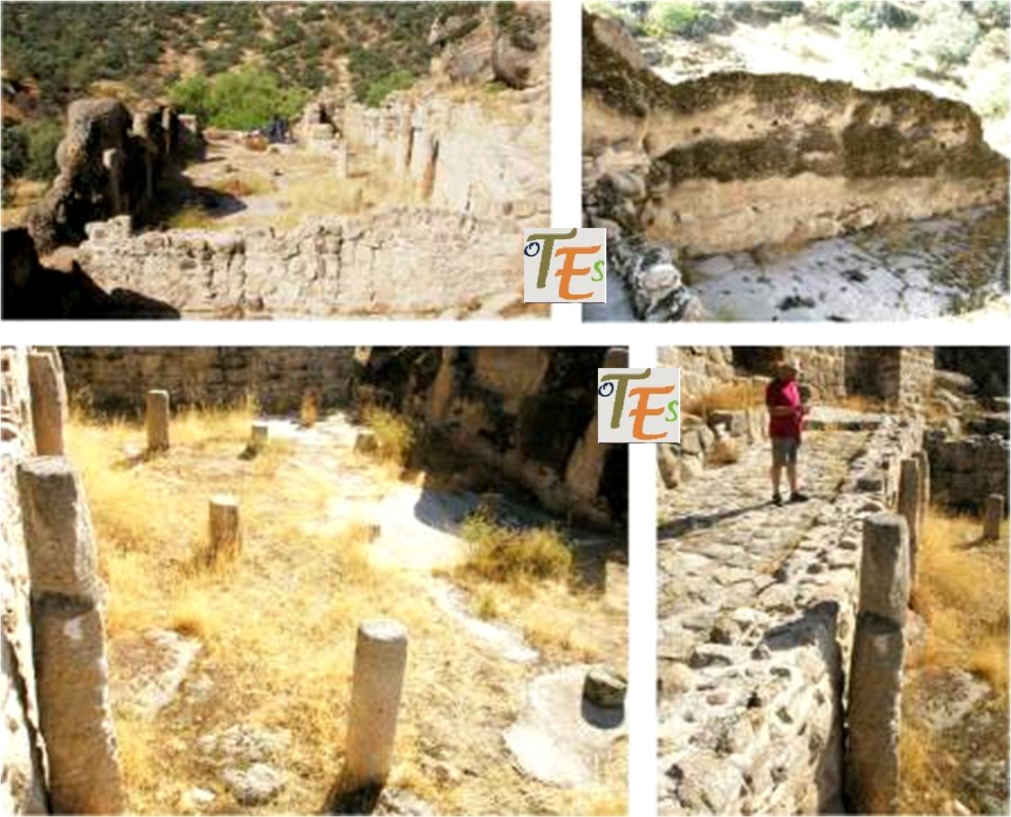 Saliendo por esa puerta, nos acercamos a los baños que servían para la higiene en esta antigua ciudad. Allí observamos lo que pudieron ser las cuatro zonas o salas como la de entrada o vestuario, la fría, la templada y la caliente, quedando en pie ahora una de sus bóvedas y parte de las paredes de otra y por encima el baño turco con su suelo de pizarra y sus asientos, o sala de vahos; estos se ve que se filtraban por la parte alta de la bóveda que queda aún en pie, pareciéndonos a nosotros que este establecimiento también puede ser de época romana. Esta es una opinión particular nuestra, que dejamos aquí plasmada, entre otras muchas que hay y que no nos obliga a estar de ningún lado, respetando todas las demás.