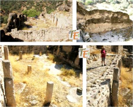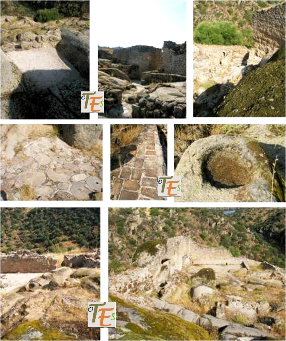 No faltan los huecos de las habitaciones con sus solados, algunos de ellos con curiosas piedras de molino, estas se debieron usar en la ciudad para moler  el trigo y hacer su pasta y su pan, otros con ladrillo, alguna zona para jardín, cazoletas para el agua y algún postigo de salida hacia el río, para facilitar la huida en caso de no soportar un ataque tanto del exterior como del interior de la medina. Lo más curioso es que los muros se solapan con las grandes piedras reaprovechadas, que forman este grandioso bosque pétreo.