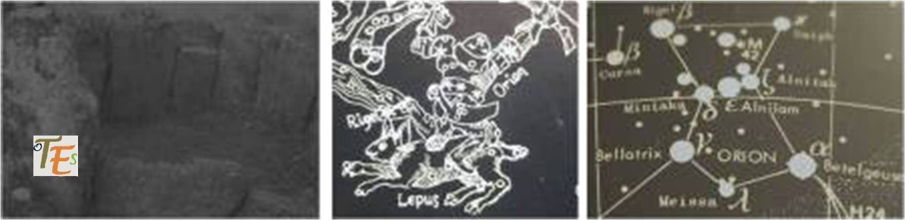 Al fondo del dolmen, hacia el Oeste, se ve la constelación de Orión, con sus perros el can mayor y el menor y la liebre “Lepus”. Guerrero que alza su arco y se cubre con el famoso vellocino. Creencia que debían de tener aquellos seres en aquellos  tiempos prehistóricos, para alcanzar otra vida superior más allá, en el paraíso.
