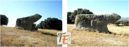Pero volviendo al “Casar del Asno” en el que nos encontramos, también vemos otra roca tallada como un tótem, determinando el cuidado de los rebaños, pues aunque deteriorada, nos parece un gran can o mastín, sentado, como guardián del lugar, mirando hacia los animales que tiene que guardar en los corrales, ya que en aquellos antiguos tiempos los lobos, eran contumaces cazadores y reyes de estos desgastados montes. Tras su gran cabeza, al fondo observamos el puente de Villapalos.