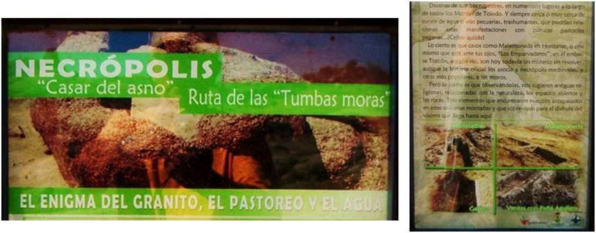 Dice también el cartel anunciador, que existe una ruta con ellas a lo largo de los Montes de Toledo (en comarcas cercanas en sus laderas del norte), de las cuales nosotros conocemos algunos de estos parajes, como el de Malamoneda en Hontanar (ver en esta página “Los Enigmas Perdidos”), el de Ventas con Peña Aguilera, el de Gálvez y este de Menasalbas. También conocemos las necrópolis de Sonseca, de Orgaz, de Arisgotas  (ver en esta página los otros diferentes paseos diurnos) y la que se encuentra al pie de la presa romana de Alcantarilla. Sin olvidar las de Toledo capital, (Castillo de San Servando y “Peña del Rey Moro”).