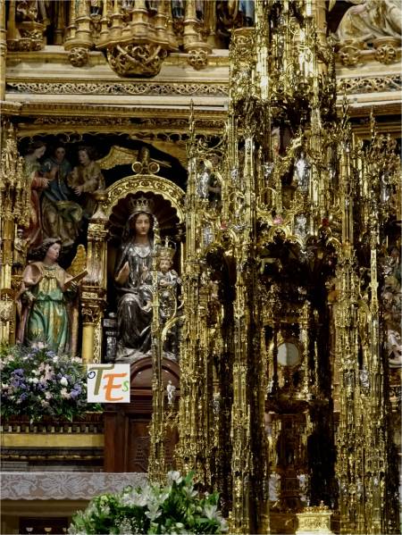 La custodia de Cisneros, brillando sobre el altar mayor de la catedral toledana, donde es observada por los cientos de figuras de reyes, santos y ángeles, tallados en piedra y conformando este lugar sagrado.
