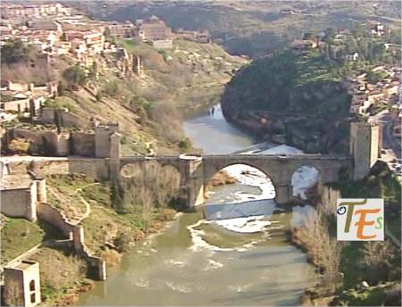 Vista aérea del puente gótico de San Martín, por donde se escapa el río Tajo, mandado restaurar por el arzobispo Dº Pedro Tenorio en 1390, unía la ciudad de Toledo con la región de la Sisla y los importantes montes del mismo nombre, los cuales abastecían a esta urbe con sus diferentes productos de caza, leña o ganados.