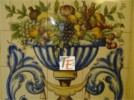 Sensacional dibujo cerámico por su pureza y pulcritud, debido a la mano del ceramista Vicente Quismondo. Entre los baldosines que le componen, vemos un bello bodegón adornado, con una fuente repleta de diferentes frutos veraniegos.