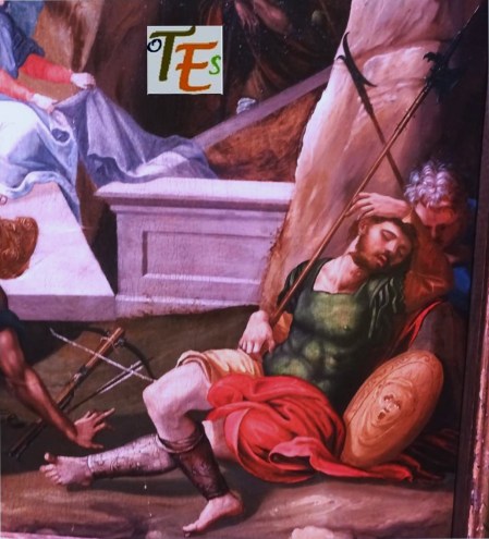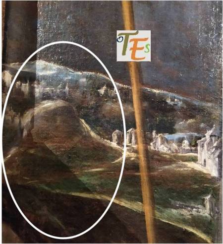 Bello detalle de una pintura perteneciente a un retablo toledano, posiblemente de Luis de Velasco, donde vemos a un soldado romano dormido, en la resurrección de Cristo.