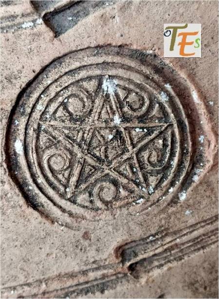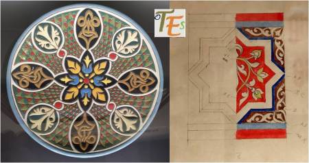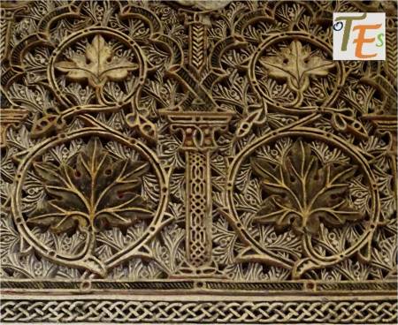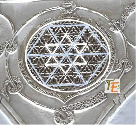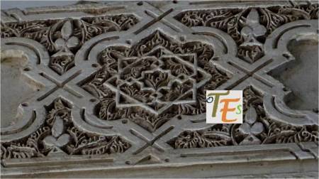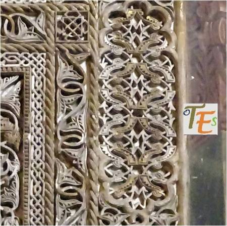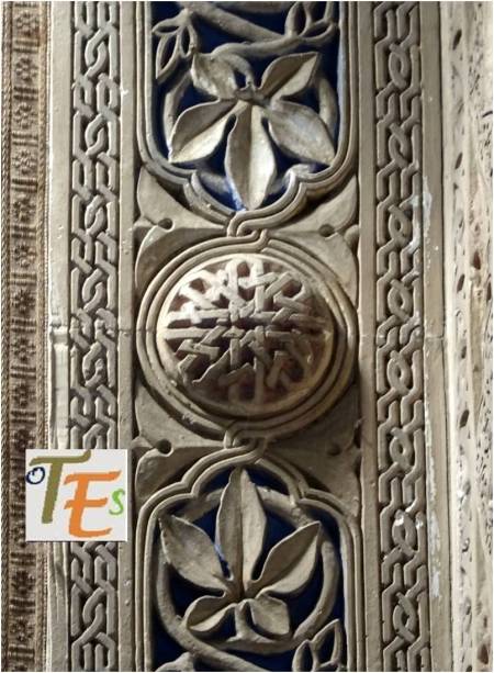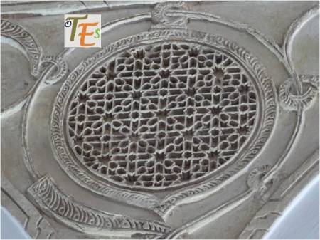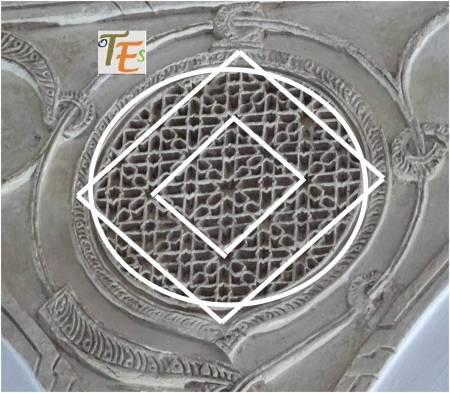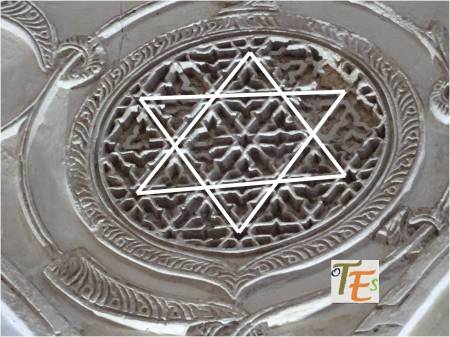 Intrincada yesería mudéjar, que forma parte de una antesala catedralicia toledana, en cuyo tallado se observan magníficos detalles geométricos y entre ellos secretamente, se ha trabajado el anagrama distintivo de la virgen María.