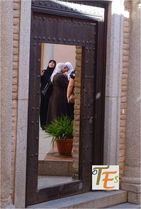 Tras la puerta de un antiguo convento toledano, el denominado como de “Jesús y María”, observamos algunas mujeres musulmanas admirando uno de sus claustros. Pese a pertenecer a diferentes religiones, tanto sus antiguas monjas como ellas, van con parecida indumentaria.