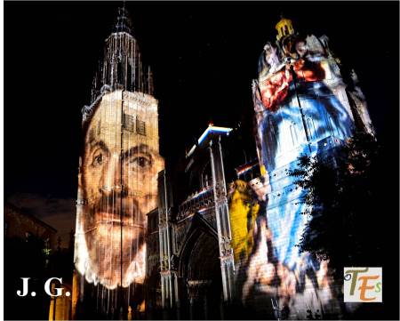 En la noche veraniega, dedicada a la proclamación anual de Toledo como Ciudad Patrimonio de la Humanidad, vemos reflejadas algunas obras de su pintor por excelencia, como es Doménico Theotocópulis, el Greco, sobre las torres delanteras norte y sur de la catedral toledana.