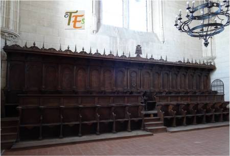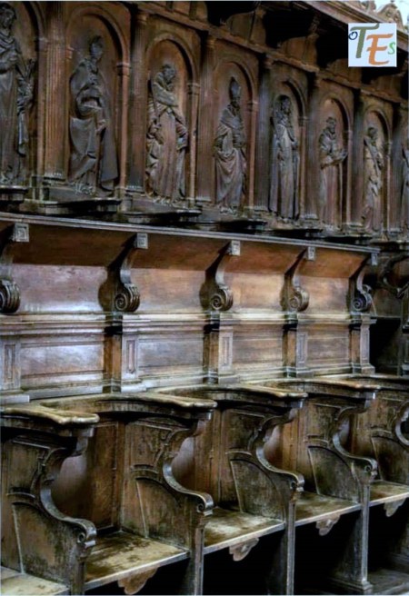 Una de las antiguas sillerías, perteneciente a uno de los conventos que aún subsisten hoy día en Toledo. Pese a su desgaste, todavía se puede observar el tallado en su parte baja y las imágenes que coronan su parte superior.