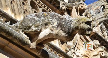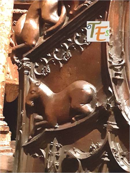 Entre la animalística fantástica que compone la talla del coro bajo catedralicio, vemos al fabuloso unicornio. Su cuerno influyó en la antigua alquimia, por medio de la medicina espagírica, siendo adquirido por los boticarios de la edad media, como antídoto universal.