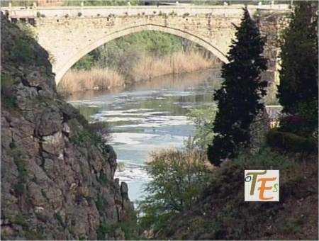 Imagen con la salida del Tajo de nuestra ciudad, hacia la Vega Baja. Le acompaña un verso de Garcilaso de la Vega, de Égloga III.