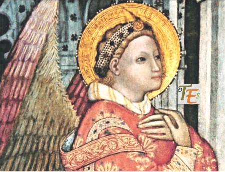 Detalle de una anunciación, con la imagen del arcángel Gabriel. Pertenece a la capilla de San Blas, que se encuentra en el claustro de la catedral toledana, con su estilo italianizante, debido a los pintores florentinos Gerardo Starnina y Nicolás de Antonio.