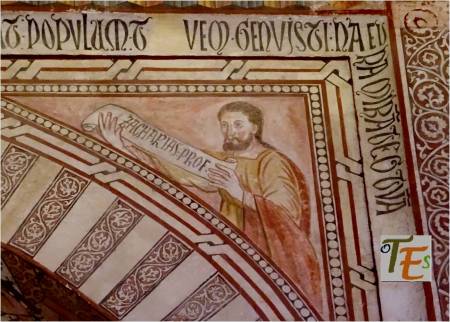 Detalle de una de las pinturas románicas al fresco con influencia omeya, que adorna la albanega de uno de sus arcos de herradura que forman la Iglesia de San Román de Toledo. En este caso se refiere al profeta Zacarías.