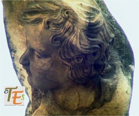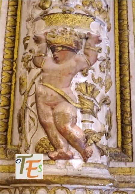Genio tallado en estilo plateresco, en la columna derecha que da paso a la capilla mortuoria de la dinastía de los Trastámara. El mismo se tapa la vista con un antifaz, por lo que representa acceder a ella.